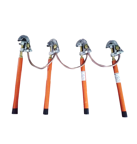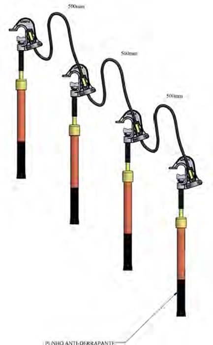 Conjunto de Aterramento e curto-circuito temporário para rede secundária de Baixa Tensão. Com 4 grampos de aterramento por torção, fixo em elemento de fibergras 025 x 300 mm com 100 mm de anti – derrapante no punho, com cabo de cobre ultra flexível transparente PVC comprimento 1200 mm, sendo 400 mm entre fases.
