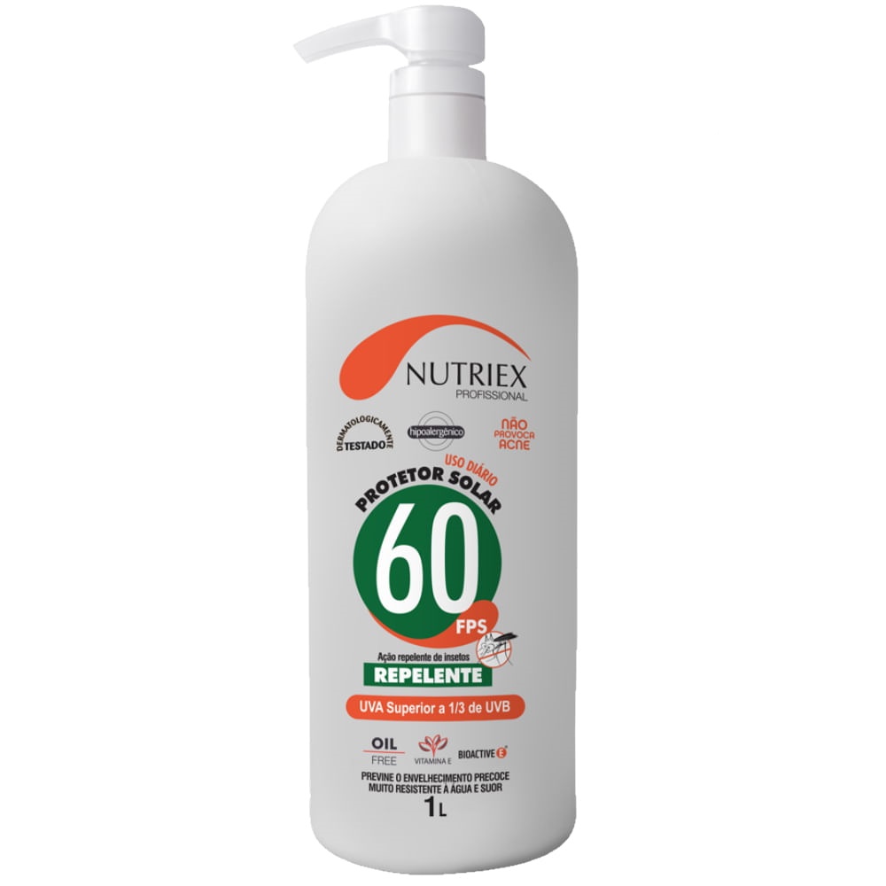 O PROTETOR SOLAR FPS 60 REPELENTE NUTRIEX PROFISSIONAL oferece muito alta proteção à pele contra os efeitos nocivos da radiação solar, prevenindo as queimaduras solares, além de proteger contra os mosquitos. Com toque seco e fácil espalhabilidade, não deixa a pele esbranquiçada e possui aplicação rápida e prática. Contém Bioactive E, poderoso antioxidante que previne o envelhecimento precoce. Além disso, minimiza os danos na pele causados pelos raios infravermelhos devido à ação antioxidante do produto. RÁPIDA ABSORÇÃO, TEXTURA LEVE, NÃO COMEDOGÊNICO, LIVRE DE CORANTES, AÇÃO HIDRATANTE. Efetivo na proteção contra os mosquitos Aedes aegypti, Culex quinquefasciatus, e Anopheles sp. Uso Profissional.